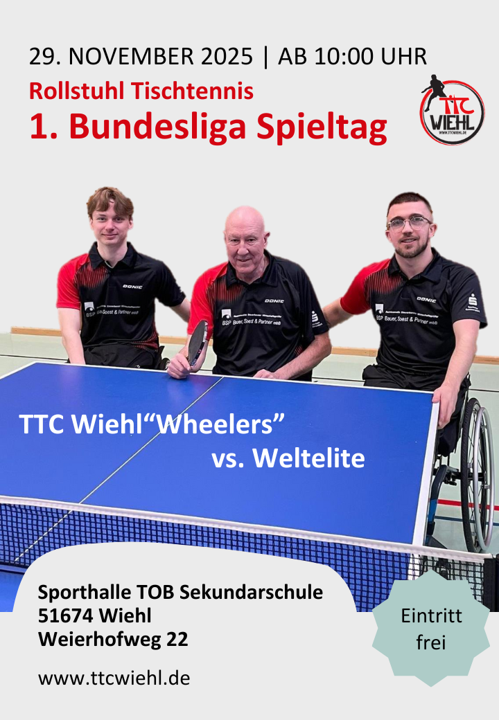 Am Samstag, 29. November, wird den Freunden des Rollstuhl-Tischtennis in der Sporthalle Bielstein erneut ein echter Leckerbissen serviert. Der TTC Wiehl richtet an diesem Tag zum zweiten Mal einen Spieltag in der 1. Bundesliga aus, bei dem die „Wheelers“, die Tischtennis-Rolli-Mannschaft des gastgebenden Vereins, alle sieben Bundesliga-Erstligisten des Deutschen Rollstuhlsportverbandes (DRS) zu Gast haben, mit dem deutschen Rekordmeister und Titelverteidiger Borussia Düsseldorf an der Spitze. Die Wiehler, die sich in der vergangenen Saison sensationell hinter Düsseldorf die deutsche Vizemeisterschaft sicherten, bestreiten an diesem Tag gleich vier Partien und wollen ihre derzeitige gute Platzierung (4:2 Punkte) weiter ausbauen, um im Kampf um den zweiten Tabellenplatz wieder ein ernstes Wörtchen mitzureden. Die „Wheelers“ werden wieder mit den beiden jungen Schweden David Olsson und Isak Nyholm antreten, die schon in der vergangenen Saison zu den besten Bundesligaspielern gehörten. Den Spieltag am Samstag eröffnen die Gastgeber um 10 Uhr direkt mit einem echten Knaller, denn dann ist der Seriensieger der Rolli-Bundesliga, Borussia Düsseldorf der Gegner. Die Düsseldorfer, die auch als aktueller Tabellenführer (6:0) nach Bielstein reisen, treten mit den beiden deutschen Nationalspielern Thomas Schmidberger und Valentin Baus an, die zu den weltbesten Tischtennisspielern im Rollstuhlsport gehören und bei Welt- und Europameisterschaften und Paralympics schon zahlreiche Medaillen für den DRS gewannen. In der vergangenen Saison leisteten die Wiehler dem hohen Favoriten aus der Landeshauptstadt zwar harten Widerstand, mussten sich am Ende aber 1:4 geschlagen geben, wobei David Olsson mit seinem Sieg gegen Valentin Baus für den Ehrenpunkt sorgte. Es bleibt abzuwarten, ob es diesmal für eine Überraschung/Revanche reicht – die Favoritenrolle hat aber das Düsseldorfer Duo inne.